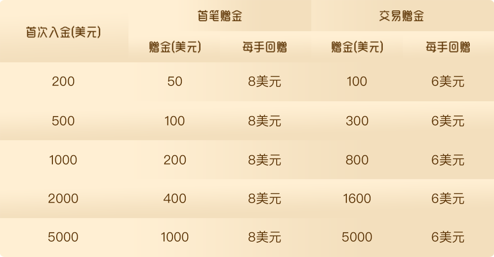 新客戶首次充值金額≥$200,聯繫客服報名參與本活動,成功登記後首筆贈金將髮放至客戶賬戶中,可直接用於交易。首筆贈金全部轉換爲可提取後即可開始領取交易贈金,活動最高可獲得6000美元。